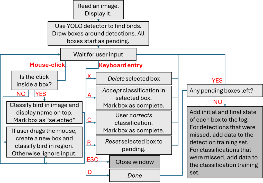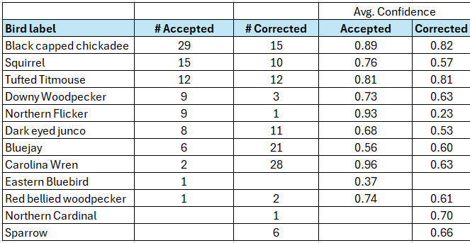 At the time of writing, I’ve used my custom detection and classification pipeline to go through 115 images, identifying 202 birds (a category which now includes squirrels 😅). Of these, 45% were correctly detected. There were 25 false detections – these were often multiple boxes for the same bird or boxes that only partially selected the bird. I accepted 92 classifications, which is also about 45%.